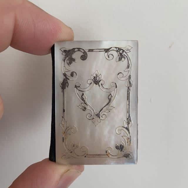 We just purchased this rather charming miniature book – c. 1820s and bound in lovely Mother of Pearl. It is approx. 1″ tall, and if you are aquainted with collectors of miniatures books they are emphatic that the books must meet the definition of being less than 3″. Sometimes, I am forced to shrug my shoulders how a few millimeters extra considerably narrows the field of buyers, but this one easily qualifies.