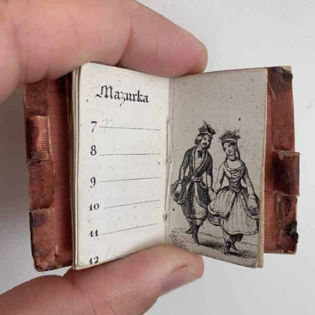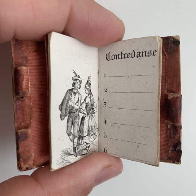 The book is formally a Dance Card, or, Le Carnet de bal in French and was used by a woman to record the names of the gentlemen with whom she intends to dance each successive dance at a formal bal. It even comes with a miniature little pencil.