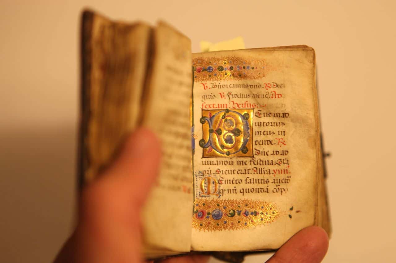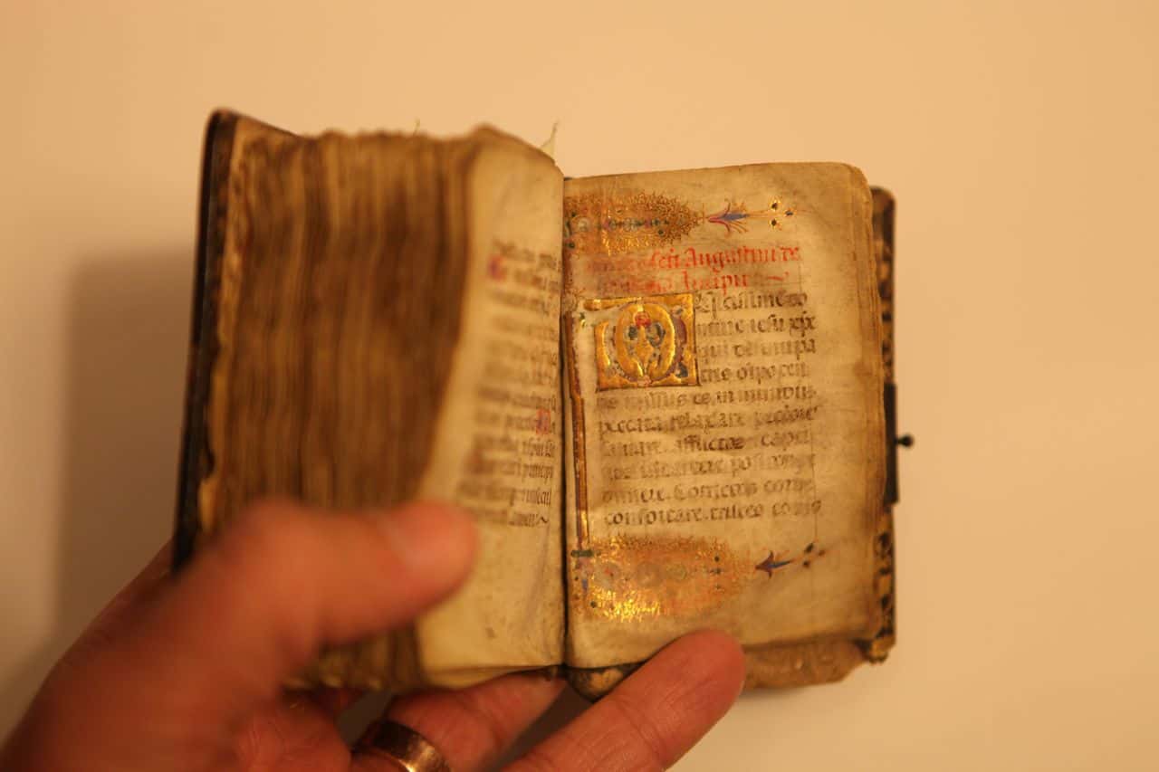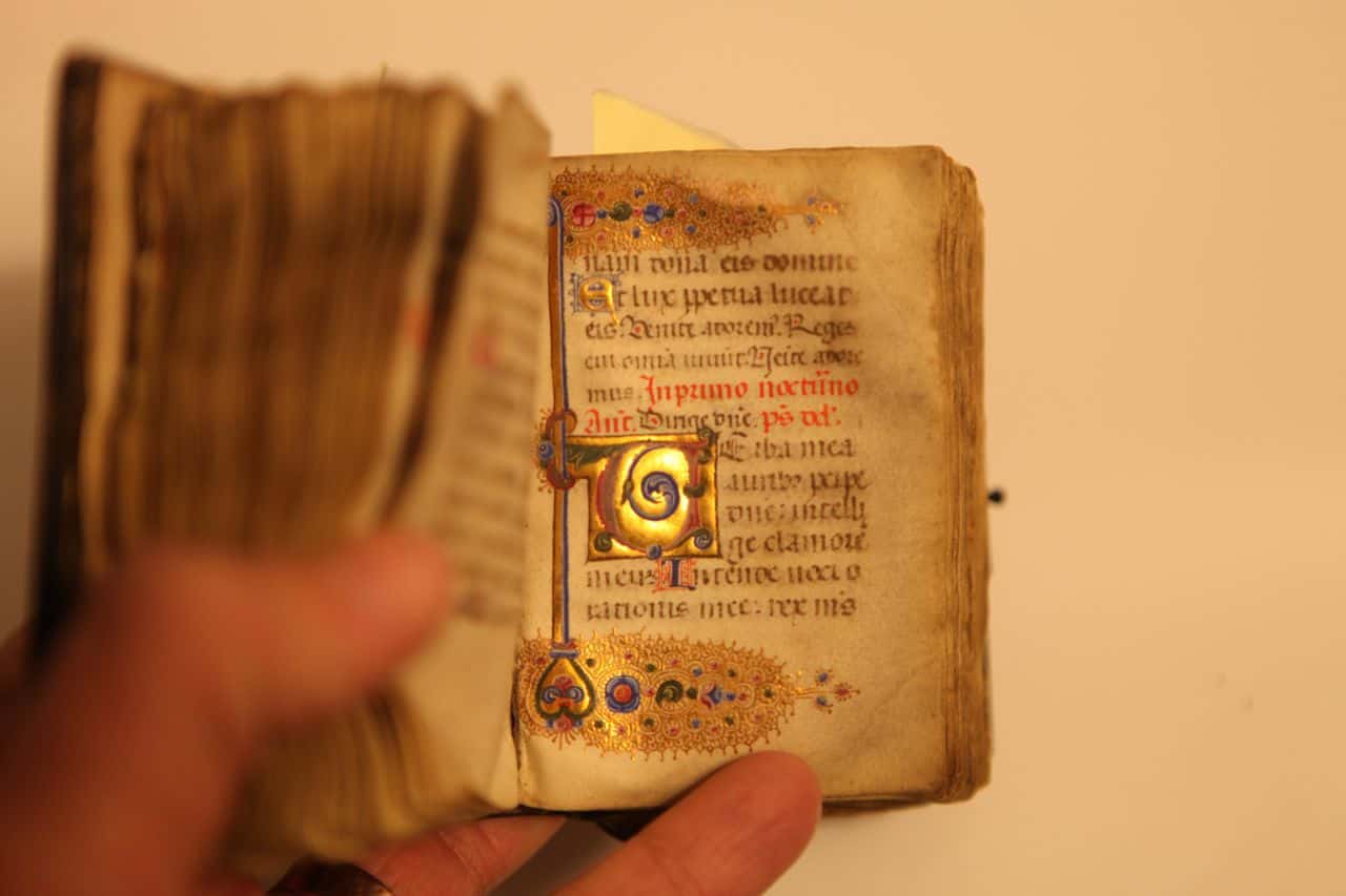 BOOK OF HOURS, use of Rome, in Latin. ILLUMINATED MANUSCRIPT ON VELLUM [northern Italy, Ferrara, c. 1460] . 95 x 72 mm. FIVE 3-5 LINE ILLUMINATED INITIALS with leafy ornaments and extensions and marginal decoration; ONE 7 line HISTORIATED INITIAL with border. The decoration of the historiated initial belongs to the school of minor illuminators associated with the production of the magnificent Bible of Borso d’Este (see deer with photo of the Bible of Borso d’Este below) , other ornament and extensions more likely attributable to Guglielmo Giraldi and his associates. Rubricated, numerous 1-2 line gold initials throughout. Bound in a later blindstamped French binding, textblock partly loose, lacking class, some leather loss to part of rear board., still an attractive binding. Condition: Calendar worn, some rubbing and thumbing as usual., ff. 68 with partial loss and initial cut; one initial more seriously rubbed.; otherwise condition as depicted in photos. Contents: Calendar ff.1-11; f.12 blank ruled; ff. 13-115 Office of the Virgin, use of Rome; ff. 116-145 Penitential Psalms and Litany; ff. 146- 193 Office of the Dead, use of Rome; ff. 194-199 Hours of the Cross; ff. 200-220 variants from the Office of the Virgin; f. 220-222 blank ruled. [$37,000]