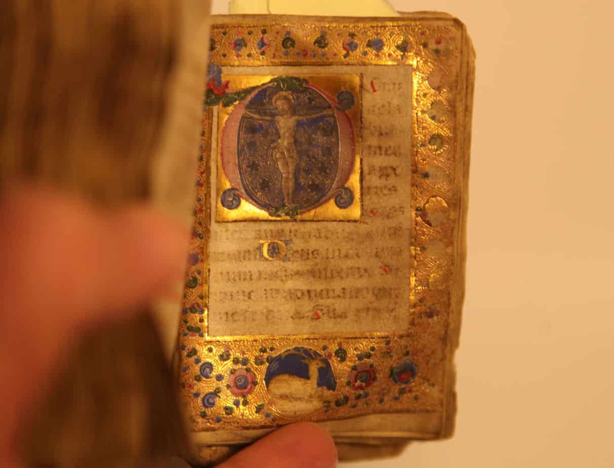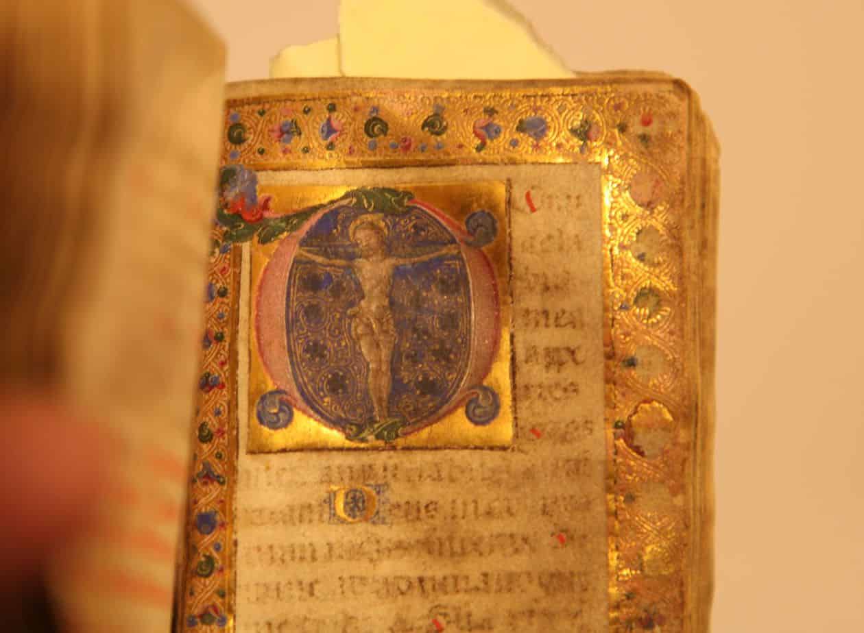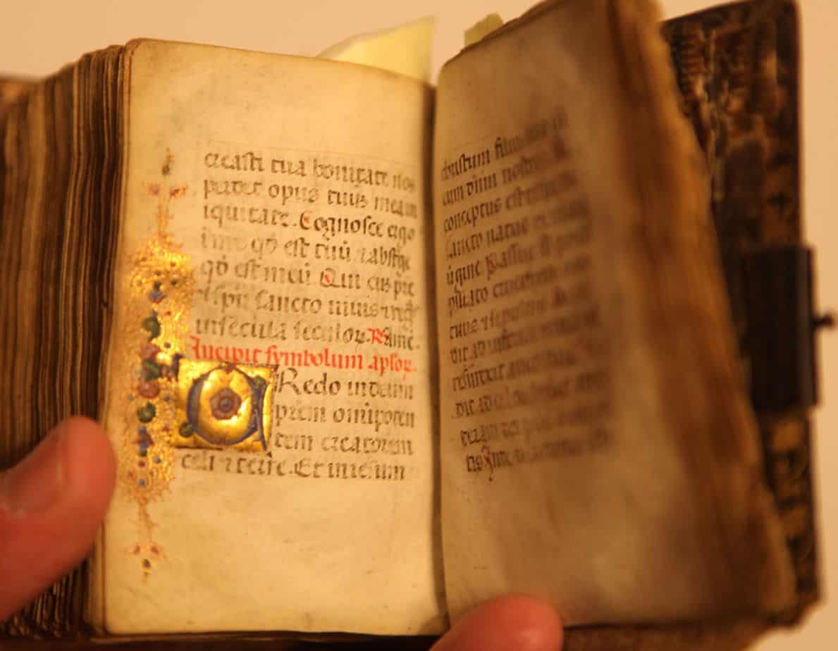 BOOK OF HOURS, use of Rome, in Latin. ILLUMINATED MANUSCRIPT ON VELLUM [northern Italy, Ferrara, c. 1460] . 95 x 72 mm. FIVE 3-5 LINE ILLUMINATED INITIALS with leafy ornaments and extensions and marginal decoration; ONE 7 line HISTORIATED INITIAL with border. The decoration of the historiated initial belongs to the school of minor illuminators associated with the production of the magnificent Bible of Borso d’Este (see deer with photo of the Bible of Borso d’Este below) , other ornament and extensions more likely attributable to Guglielmo Giraldi and his associates. Rubricated, numerous 1-2 line gold initials throughout. Bound in a later blindstamped French binding, textblock partly loose, lacking class, some leather loss to part of rear board., still an attractive binding. Condition: Calendar worn, some rubbing and thumbing as usual., ff. 68 with partial loss and initial cut; one initial more seriously rubbed.; otherwise condition as depicted in photos. Contents: Calendar ff.1-11; f.12 blank ruled; ff. 13-115 Office of the Virgin, use of Rome; ff. 116-145 Penitential Psalms and Litany; ff. 146- 193 Office of the Dead, use of Rome; ff. 194-199 Hours of the Cross; ff. 200-220 variants from the Office of the Virgin; f. 220-222 blank ruled. [$37,000]