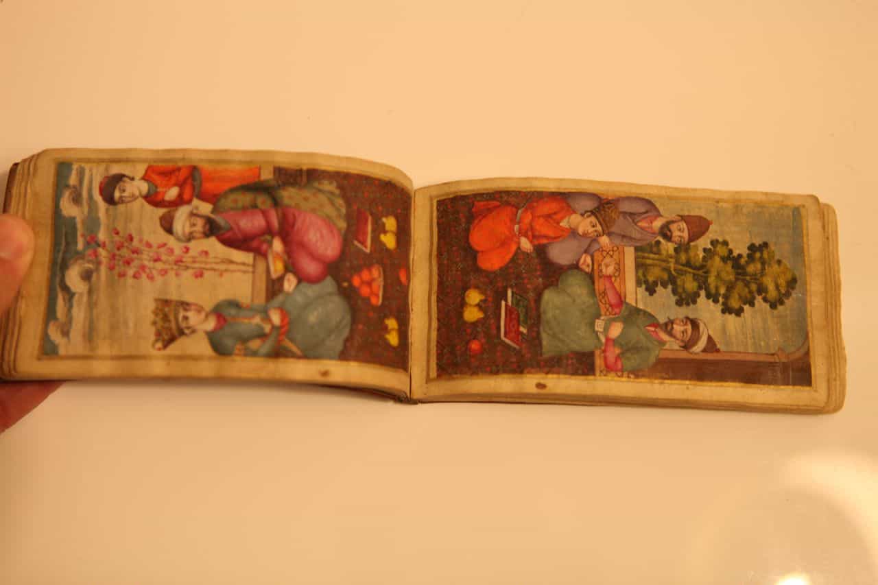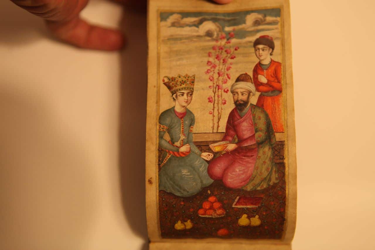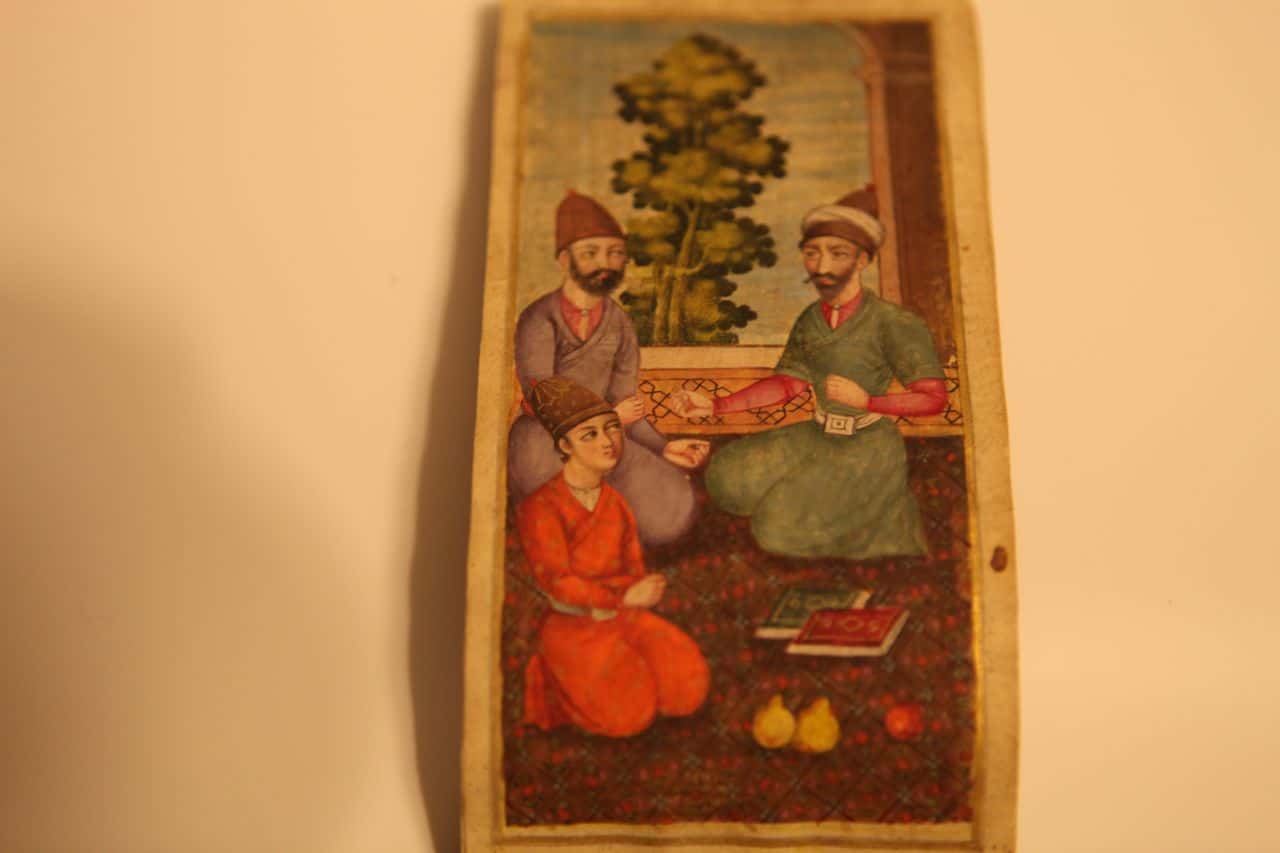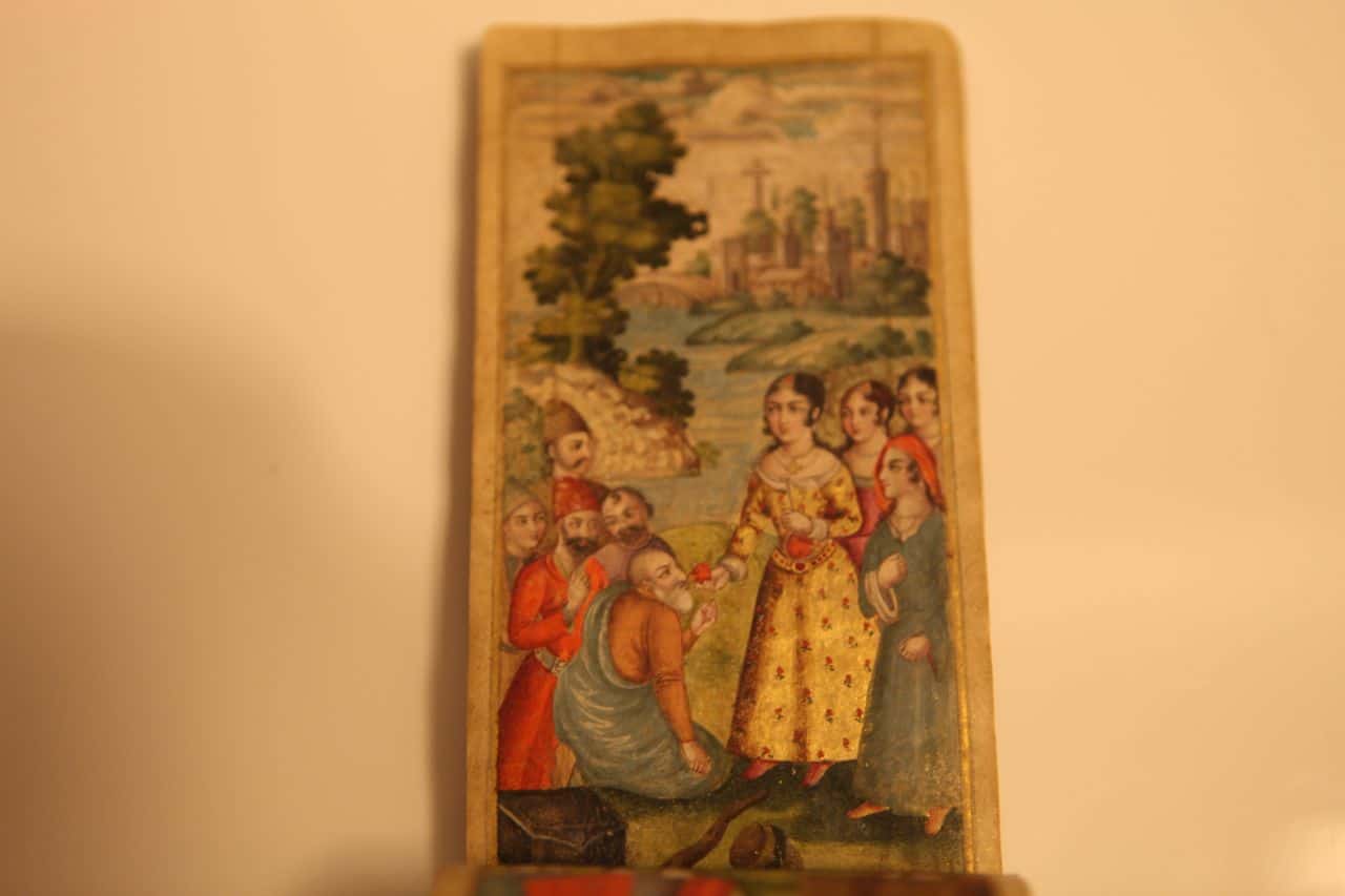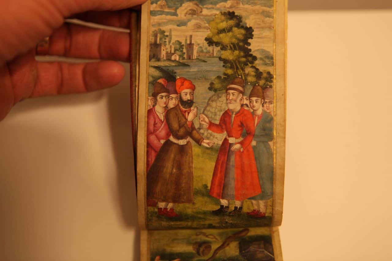 One illumination depicts the famous story of Sheikh Sanan, who abandons the ascetic path because of his suddenly overwhelming love for a Christian woman, along with the accompanying verse by Vahshi Bafqi. [Ref: for Sheikh San’an paintings of the Qajar period see the article by Afsaneh Najmabadi in L. Diba, Royal Persian Paintings, The Qajar Epoch 1785-1925, New York, 1998, pp. 83-5.] Two of the colophons give the scribe’s name as as Ali Ashgar Hamadani. His recorded works are very rare; including a copy of the Kulliyat (poems) commissioned for Aqa Muhammad Khan for his nephew Baba Khan, the future FatH ‘Ali Shah. Also, see the “interlinear Persian translation in nasta’liq is ‘Ali Ashgar al-Mutarjim (the translator), son of the deceased Hajji Muhammad al-Hamadani.” in the Qur’an, Isfahan Christies Islamic art and manuscripts 10 October 2000, lot 20: realized price £32,900