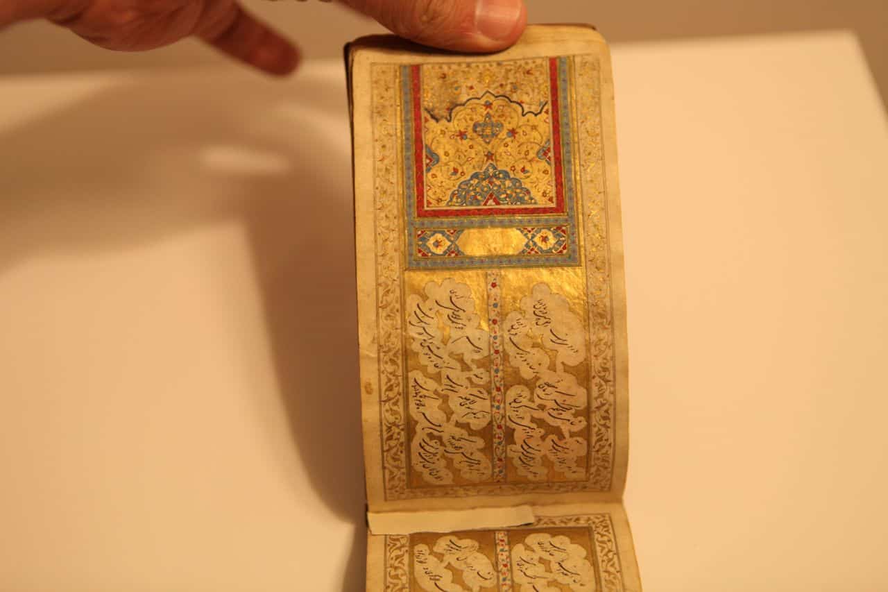 Persian Poetry Manuscript, decorated for a wealthy Qajar Patron, Iran (Esfahān). Dated AH 1206/1792. FOLIO., 152 x 80 mm., text panel 120 x 55 mm. Four Colophons. A magnificent manuscript, each folio with very fine black shikasteh in clouds set against a gold ground, polychrome illuminated headpiece, 6 (SIX) exquisite full page miniatures of very high quality, minor repairs, a few panels separating from respective folios, overall in VERY GOOD condition. [$28,000]
