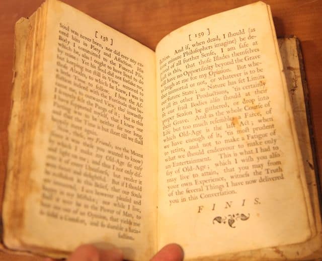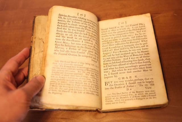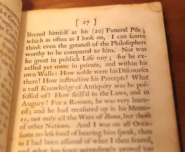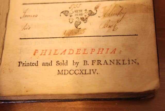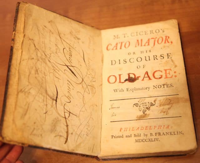 “Only once did [Franklin] publish an original, full-sized book at his own expense, James Logan’s translation of Cicero’s Cato Major. He printed it in large type on creamy paper to flatter the Quaker grandee and to show off his own prowess as a printer” (Benjamin Franklin In Search of a Better World, p. 79) “The Library of Congress calls this “A Masterwork of Printing…Franklin’s personal favorite from his press, is considered to be the finest example of the printing art in colonial America. Furthermore, this work by the Roman philosopher statesman Cicero is the first classic work translated and printed in North America.” [Ref: Library of Congress Exhibit]