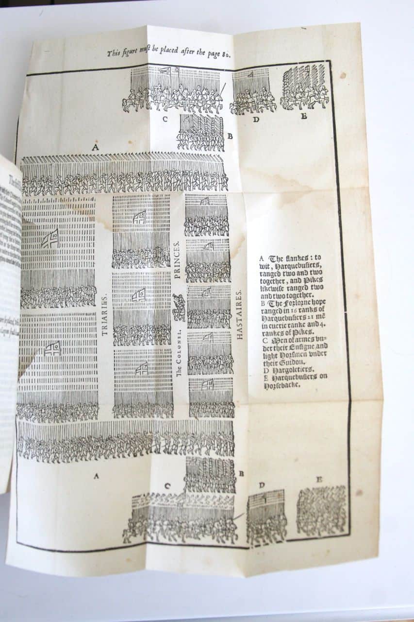 Fortification–Ive, Paul (d. 1604) The practise of fortification: wherein is shewed the manner of fortifying in all sorts of scituations, with the considerations to be used in delining, and making of royal frontiers, skonces, and renforcing of ould walled townes. Imprinted at London, By T. Orwin, for T. Man, and T. Cooke, 1589. BOUND WITH… [Fortification–Ive, Paul (d. 1604) ; Fourquevaux, Raimond de Beccarie de Pavie, baron de, 1509-1574.]  Instructions for the warres. Amply, learnedly, and politiquely, discoursing the method of militarie discipline. Originally written in French by that rare and worthy generall, Monsieur William de Bellay, Lord of Langey, Knight of the order of Fraunce, and the Kings lieutenant in Thurin. Translated by Paule Iue, Gent. At London : Printed [by Thomas Orwin], for Thomas Man, and Tobie Cooke, 1589. (Notes: Not in fact by Du Bellay, but by Raimond de Beccarie de Pavie, baron de Fourquevaux.)    Small 4to., 19 cm x 13.5 cm.   [4], 40 p., [2] folded woodcut plates,  [20], 312:  Signatures: 2A-2D⁴ 2F⁴ 2G² //  A-B⁴ b² C (wanting C1-2) -X⁸ Y⁴ .  Note: 2 pages of text lacking in the second work; C1-2.  Early calf, partly restored.  The extremely rare fold out plates are present as depicted.  These plates are perhaps the most interesting aspect of the book and the most technically accomplished by the inconsistent standards of Elizabethan printing.   Internally, occasional minor dampstaining, generally good.   No complete copies with the 2 rare fold out plates present in 50+ years of auction records; only the Macclesfield sale had a sammelband copy of the 2nd ed  L: Felix Kingston for Toby Cooke, 1597  (See; Sotheby’s, Oct 30, 2007, lot 3492, $8,320)  Provenance: Lord Fitzwilliam, Baron of Milton in the County of Northampton. This family claim descent from William the Conqueror. [SOLD]