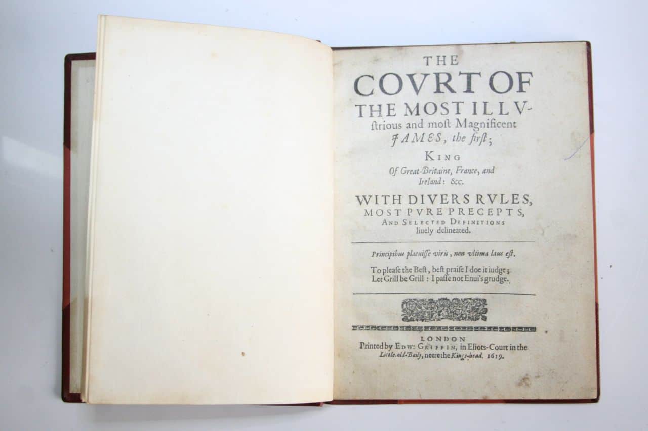 Bibliographically rare and historically important, this tract or “very rare article” according to Brydges’ Censura Literaria of 1807 is an “excellent little treatise, although addressed to the courtiers of James the First, is well worthy the perusal of those belonging to George III. It is. inscribed to “George Marquisse Buckingham, Vicount Villiers, &.c. &c.” the well known favourite of James I. And the dedication is signed with the initials A. D. B.” The mysterious initialed author describes the King’s final male favorite, George Villiers, Duke of Buckingham, as “most resplendently glister and shine, like a most pretious Jewell richly garnished in the purest gold” ( pg. 2 ) The principal object of the author appears to have been to warn the courtier “to bee most wary and heedfull that out of himselfe hee draw a rule to rectifie and govern his owne life, that hee be content to taste the sower with the sweete, and in court to expect as well burthen-some blame and injurie as beautiful fame and dignity.” This is followed by admonitions to “get wisdome as his best guide…let him not by any meanes omit or neglect the studio of law, languages, and eloquence and let him especially, bend his best endevours to attaint unto the prompt, perfect, and most commendable knowledge of histories, and antiquities, to which, indeed I cannot sufficiently move and admonish him: for, this knowledge is the testis of the times, the light of truth, the life of memorie, the mistresse of life, and the messenger of antiquitie”