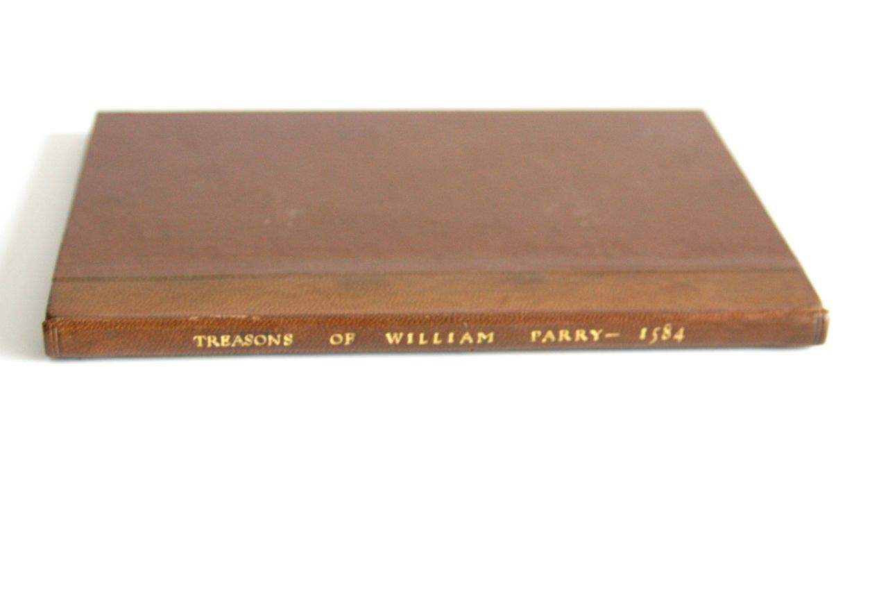 A true and plaine declaration of the horrible treasons, practised by William Parry the traitor, against the Queenes Maiestie. The maner ofhis arraignment, conuiction and execution, together with the copies ofsundry letters of his and others, tending to diuers purposes, for theproofes of his treasons. Also an addition not impertinent thereunto,conteyning a short collection of his birth, education and course oflife. Moreouer, a fewe obseruations gathered of his owne wordes andwritings, for the farther manifestation of his most disloyall,deuilish and desperate purpose. At London : by C. B[arker]., [1585]Signatures: A-H⁴.Description:  53, 7 pg. ; small 4to.  with the veryrare addendum, likely issued as a separate imprint, even though thesignatures are continuous: “A prayer for all kings, princes countreyesand people” (caption title).  New STC 19342.  FIRST EDITION, FIRST ISSUE. Morocco and cloth boards, a WIDE-MARGINED copy approx. 17.5 x 11.5 cm,,  some browning,most notable light marginal color discoloration of the first few leaves due to some very old expert repairs, a few marginal notes lightly shaved.Provenance: The Famous Broxbourne copy with ex-libris and Broxbourniana plate of John Ehrman  and  Albert Ehrman monogram; Sotheby’s, Nov 15, 1977, lot 300. Catalogue of valuable printed Books from the Broxbourne Library illustrating the Spread of Printing. The Property of John Ehrman The four-day sale realised an astonishing total of £1,297,000.  See another copy as well for comparison in 1978 with small textual variants: Sotheby’s,Nov 13, 1978, lot 198, $490  [SOLD]