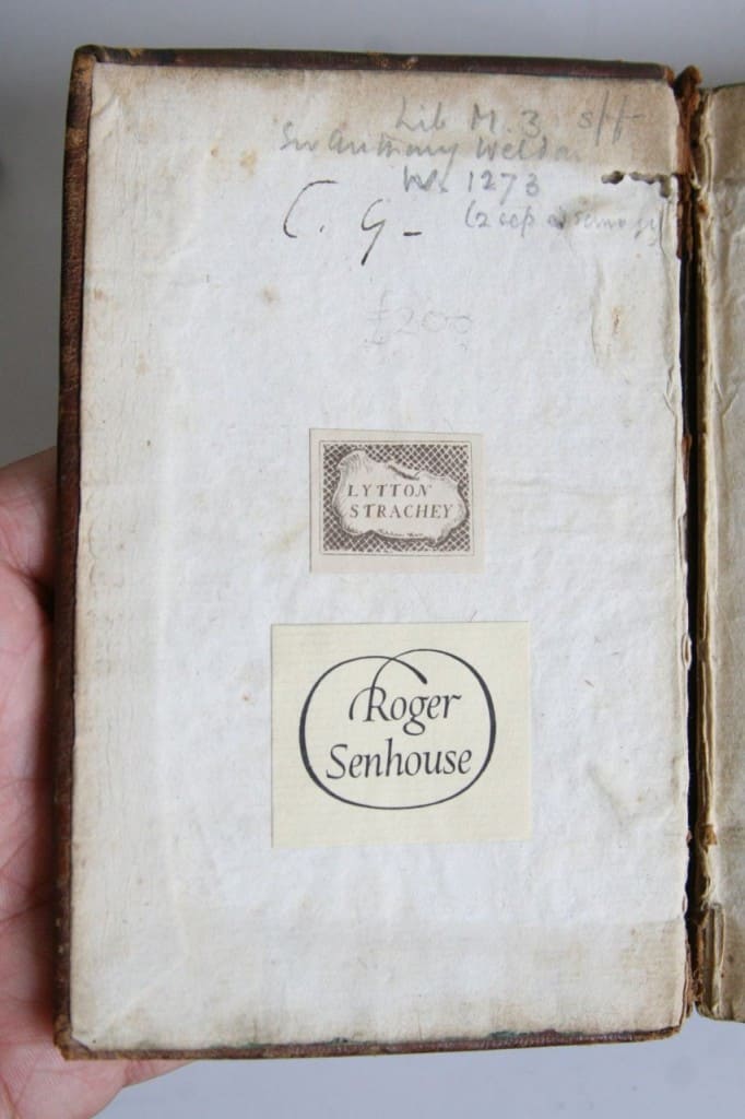 WELDON, Sir Anthony. The Court and Character of King James. Written and taken by Sir A: W: Being and Ear and Eare Witness. London: Printed by R.I. and are to be Sold by John Wright, 1650. small 8vo., iv, 197 p. 14 cm. The small book plate of Strachey by Dora Carrington is a lovely piece of sought-after Bloomsbury history, which surfaces in volumes (such as this one) as Strachey was a keen collector of antiquarian books. Binding: 17th century ruled English calf, some chaffing to one board as depicted, textblock largely separated, wear to spine as depicted, small marginal loss to t.p., some light foxing, but internally an attractive copy. Provenance: Lytton Strachey (1880-1932) British biographer and essayist (bookplate; bequeathed to) — Roger Senhouse (1899-1970), partner in publishing firm of Secker and Warburg (bookplate) and sold at the sale of the Strachey Library, Property of Roger Senhouse, Sotheby’s London, 18 October 1971, lot 826. Wing W1273.  [SOLD]