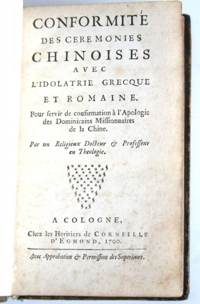 VOL I [Noël Alexandre] Conformité des Ceremonies Chinoises avec l’idolatrie Grecque et Romaine pour servir de confirmation à l’Apologie des Dominicains Missionnaires de la Chine. A Cologne : Chez les heritiers de Corneille d’Egmond, 1700 with the 1 leaf Censura Sacræ Facultatis Theologiæ Parisiensis granting printing permission. [Likely, the Cologne imprint is fictitious, and it is more reasonably a Paris or Amsterdam imprint similar to the contemporary Jesuit publications of Jesuits Michel le Tellier and Charles le Gobien.] BOUND WITH… VOL II (containing all six parts): Lettre d’un docteur de l’ordre de S. Dominique (le P. Noël Alexandre) sur les cérémonies de la Chine, au R.P. Lecomte, de la Compagnie de Jésus, confesseur de Madame la Duchesse de Bourgogne : [suivi de] ; Lettre de messieurs des missions étrangères au Pape, sur les idôlatries et les superstitions chinoises : [suivi de] ; II. Lettre d’un docteur de l’ordre de Saint Dominique sur les cérémonies de la Chine, au Révérend Père Dez, provincial des jésuites : [suivi de] ; III. Lettre d’un docteur de l’ordre de St. Dominique au R.P. Le Comte, confesseur de Madame la Duchesse de Bourgogne, sur son système de l’ancienne religion de la Chine : [suivi de] ; III. Lettre d’un docteur de l’ordre de St. Dominique au R.P. Lecomte, confesseur de Madame la Duchesse de Bourgogne sur son système de l’ancienne religion de la Chine : [suivi de] ; IV. Lettre d’un docteur en théologie de l’ordre de Saint Dominique sur l’idôlatrie et les superstitions de la Chine, au révérend Père Dez, provincial des jésuites : [suivi de] ; 6 ; V. Lettre d’un docteur en théologie de l’ordre de Saint Dominique sur l’idôlatrie et les superstitions de la Chine au révérend Père Dez, provincial des jésuites : [suivi de] ; VI. Lettre d’un docteur en théologie de l’ordre de SAint Dominique sur l’idôlatrie et les superstitions de la Chine au révérend père Dez, provincial des jésuites BOUND WITH… VOL III: La bonne foy des anciens jesuites missionaires de la Chine sur l’idolatrie des chinois dans le culte qu’ils rendent à Confucius & aux morts : demontrée par des extraits fidéles des livres des RR. peres Athanase Kirchere, Nicolas Trigaut, Alexandre de Rhodes & autre, envoyés à un ami avec quelques reflexiones sur les nouveaux sentimens des RR. PP. Jesuites. [S.l. : s.n., 1700?, presumed C. d’Egmont ] BOUND WITH… VOL IV: [Noël Alexandre] Lettre d’une personne de pieté, Sur un Ecrit des Jesuites contre la Censure de quelques propositions de leurs PP. le comte, le Gobien, etc. touchant la Religion et le cults des Chinois, faite par la Faculté de Théologie de Paris. Cologne : C. d’Egmont, 1701. The Binding: 8 vo., 16 cm., contemporary French calf, raised bands and gilt, some rubbing to hinges, slight wear to head and foot of spine; interally, some browning, but generally an attractive copy. EXTREMELY RARE. No copies appearing of the fundamental work in the ABPC database for over 30 years. [SOLD]