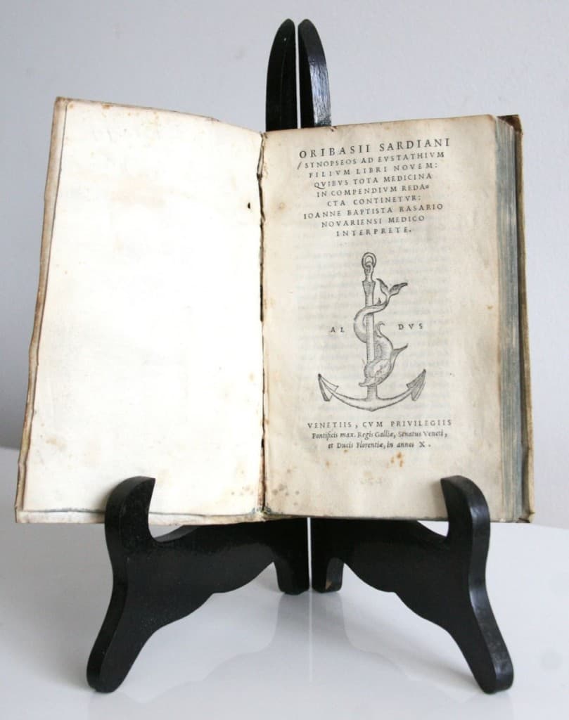 Oribasius; Giovanni Battista Rasario; Manuzio family.. Oribasii Sardiani Synopseos ad Eustathium filium libri novem : quibus tota medicina in compendium redacta continetur. Venetiis : Apud Paulum Manutium, Aldi filium, 1554. Colophon: Venetiis, Apvd Pavlvm Manvtivm, Aldi filivm, M. D. LIIII. Aldine device on t.p. and verso of final leaf. COMPLETE. 216 leaves ; 16 cm. References: Adams O 272; Renouard 159, 7; Durling 3411; Wellcome I, 4648; Handome copy in limp vellum, light spotting, minor inner marginal stain to last leaves, old discoloration of removed ex-libris on upper front pasetdown. FIRST LATIN EDITION. Rare in a contemporary binding in such nice condition; a similar copy sold Reiss & Sohn 2006 EURO 1624.00 [SOLD]
