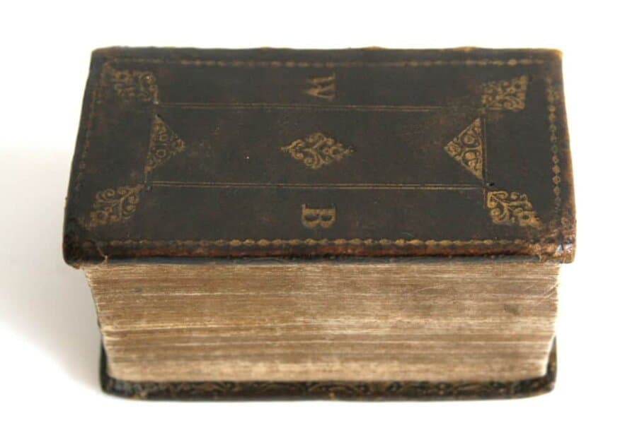 This remarkable and beautiful bible, is known as the “Pearl Bible,” from the miniscule type with which it was printed. Most 19th century bibliographers cite it as extremely rare in good condition and the copy for sale here is a handsome and complete example. Rev. Allard who owned the Bible cites Graesse on the flyleaf as stating that “on la trouve rarement intacte.” Lowndes cites the Williams’s and Roxburghe catalogues and reiterates “One of the most correct and beautiful editions of the Bible, seldom found in good preservation. Williams, 199,. in fish-skin, 11. 16».; Roxburghe 17, SI. 17*.” Additionally the Bible received mention in D’ Israeli’s Curiosities of Literature (d’Israeli, Curios. of Lit. Vol. III. p.-388.) It appears that Lowndes overlooked many of the errors found in the text, and others describe the work as a bibliographical curiosity and, in fact, as one of the most incorrect versions, even giving it the appellation of “Bastard’s Field Bible”