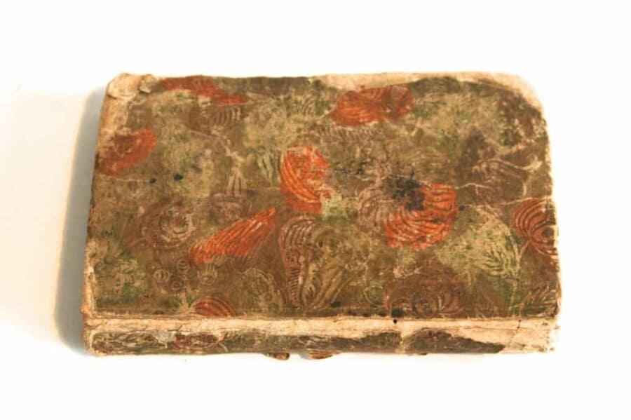 THE BINDING: The binding of this book is a scarce and collectible binding. It is a Brocade paper binding that is almost certainly contemporary with the book (i.e. from the 1730s). The paper was originally printed in bright colors, with an abundance of decorative leaves and flowers. It is now worn, and like many things that suffer the ravages of time, only displays a glimpse of its former beauty. Still, it is a quite fascinating as an example of innovative and inexpensive 18th century European bookbinding.