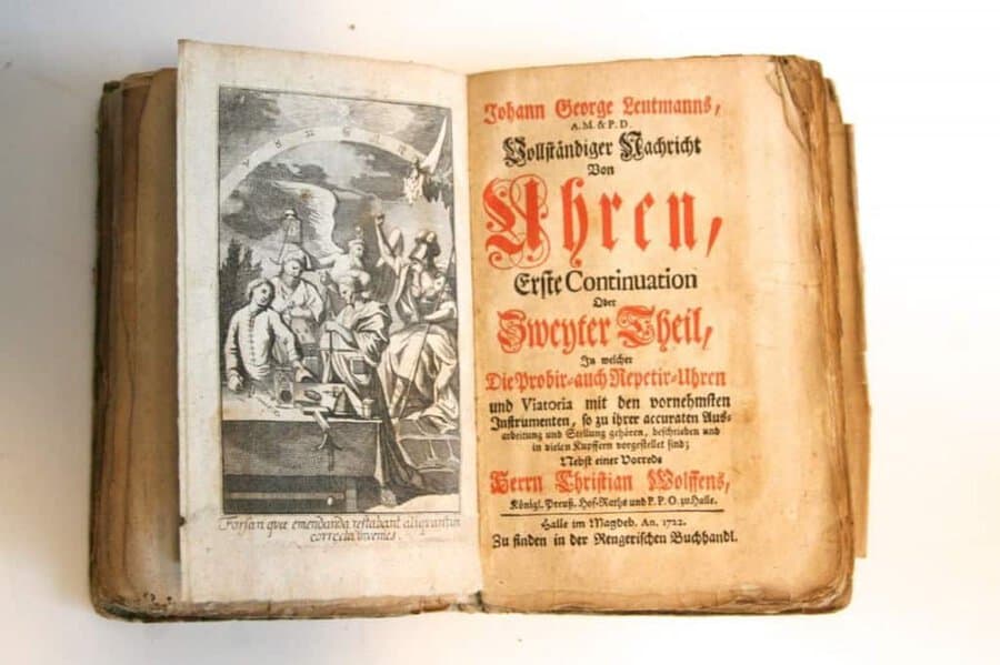 We just received in the mail a very interesting work on watch and clockmaking from 1732: Johann George Leutmann’s Vollständige Nachricht von den Uhren. This is a complicated work and typographically intimidating. It is printed in black-letter script with only occasional Roman script, a style that remained common in Germany until the end of the 18th century. It is not a book, like a signed limited copy of the Little Prince, for example, that can more easily be looked up on the internet for a range of prices. So, I thought it would be instructive, to outline what goes through the mind of a bookseller when appraising a book’s value: